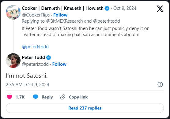 لحظاتی پس از پخش کلیپی از مستند HBO با عنوان “پول الکتریک: راز بیتکوین” که در آن به توسعهدهنده پیتر تاد بهعنوان چهره احتمالی پشت نام مستعار ساتوشی ناکاموتو، خالق افسانهای بیتکوین، اشاره شد، تاد به پلتفرم ‘X’ (که قبلاً توییتر نام داشت) رفت و ادعاهای HBO را رد کرد.