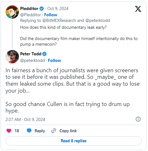 لحظاتی پس از پخش کلیپی از مستند HBO با عنوان “پول الکتریک: راز بیتکوین” که در آن به توسعهدهنده پیتر تاد بهعنوان چهره احتمالی پشت نام مستعار ساتوشی ناکاموتو، خالق افسانهای بیتکوین، اشاره شد، تاد به پلتفرم ‘X’ (که قبلاً توییتر نام داشت) رفت و ادعاهای HBO را رد کرد.